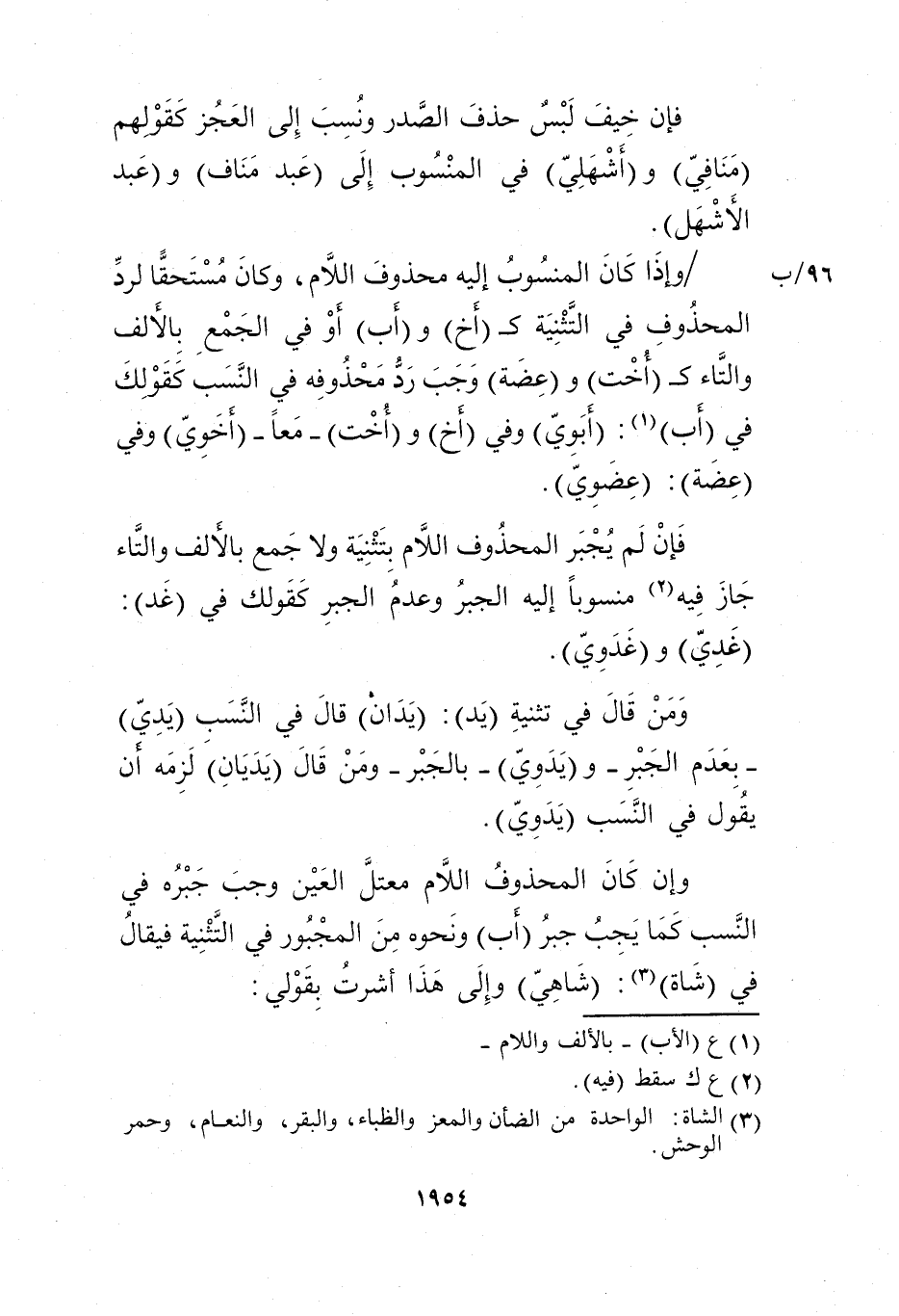 وإن كان المحذوف اللام معتل العين وجب جبره في النسب كما يجب جبر "أب" ونحوه من المجبور في التثنية فيقال في "شاة"3: "شاهي" وإلى هذا أشرت بقولي: