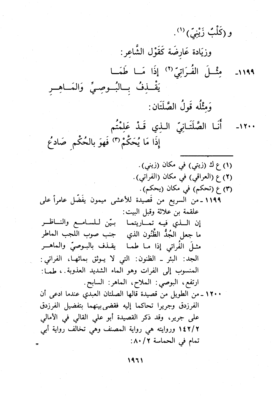 1200- من الطويل من قصيدة قالها الصلتان العبدي عندما ادعى أن الفرزدق وجريرًا تحاكما إليه فقضى بينهما بتفضيل الفرزدق على جرير، وقد ذكر القصيدة أبو علي القالي في الأمالي 2/ 142 وروايته هي رواية المصنف وهي تخالف رواية أبي تمام في الحماسة 2/ 80: