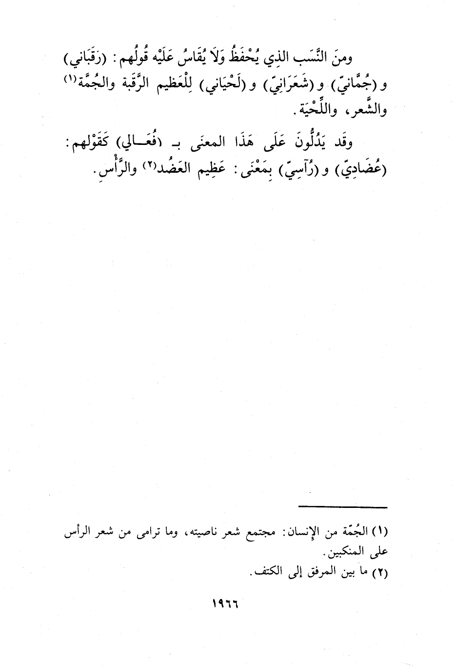 ومن النسب الذي يحفظ ولا يقاس عليه قولهم: "رقباني" و"جماني" و"شعراني" و"لحياني" للعظيم الرقبة والجمة1 والشعر، واللحية.