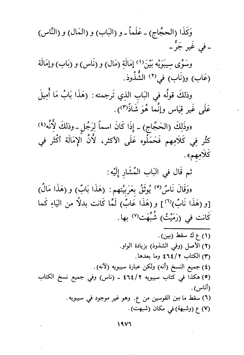 "وذلك "الحجاج" -إذا كان اسمًا لرجل -وذلك لأنه4 كثر في كلامهم فحملوه على الأكثر؛ لأن الإمالة أكثر في كلامهم".
