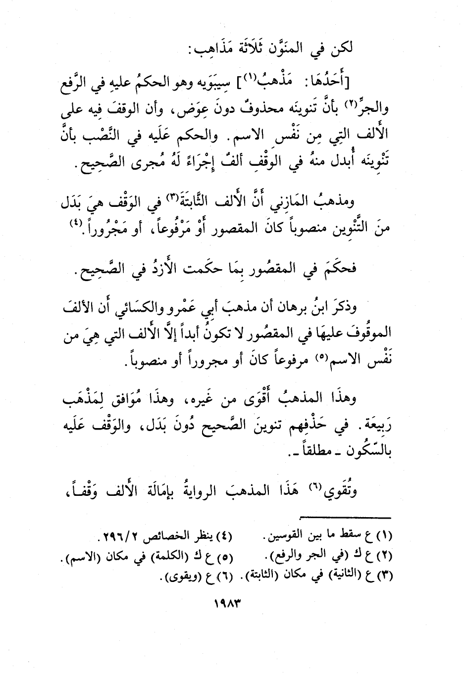 [أحدها: مذهب1] سيبويه وهو الحكم عليه في الرفع والجر2 بأن تنوينه محذوف دون عوض، وأن الوقف فيه على الألف التي من نفس الاسم. والحكم عليه في النصب بأن تنوينه أبدل منه في الوقف ألف إجراء له مجرى الصحيح.