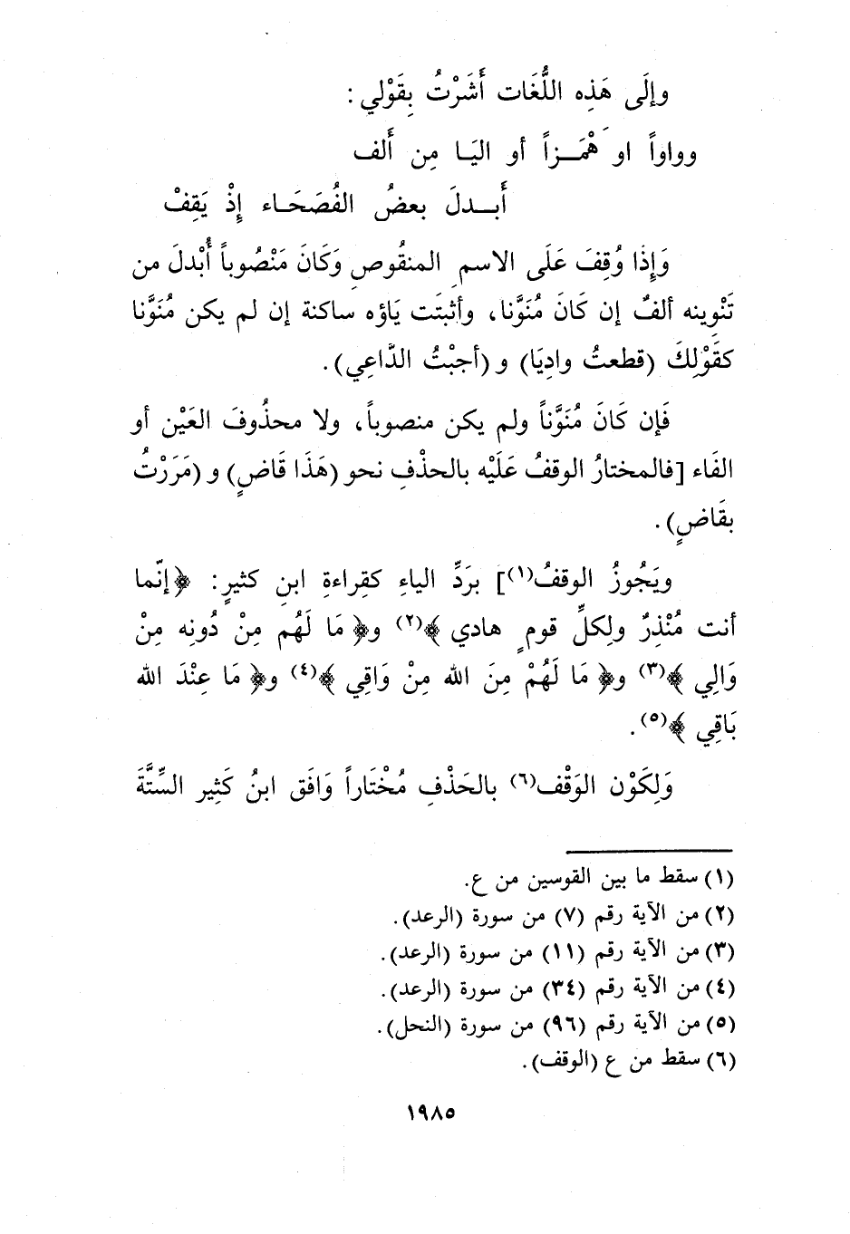 ويجوز الوقف1] برد الياء كقراءة ابن كثير: "إنا أنت منذر ولكل قوم هادي"2، و"وما لهم من دونه من والي"3, "وما لهم من الله من واقي"4، "ما عند الله باقي"5.