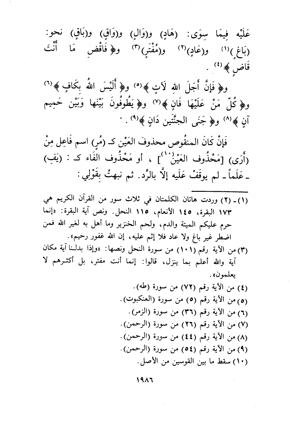 و {فَإِنَّ أَجَلَ اللَّهِ لآتٍ} 5 و {أَلَيْسَ اللَّهُ بِكَافٍ} 6 و {كُلُّ مَنْ عَلَيْهَا فَانٍ} 7 و {يَطُوفُونَ بَيْنَهَا وَبَيْنَ حَمِيمٍ آنٍ} 8 و {جَنَى الْجَنَّتَيْنِ دَانٍ} 9.