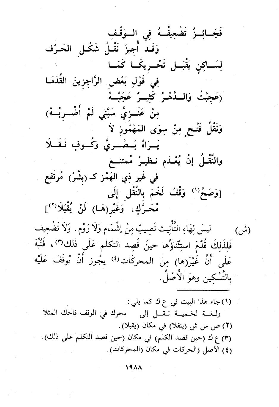 ليس لهاء التأنيث نصيب من إشمام ولا روم. ولا تضعيف فلذلك قدم استثناؤها حين قصد التكلم على ذلك3، فنبه على أن غير"ها" من المحركات4 يجوز أن يوقف عليه بالتسكين وهو الأصل.