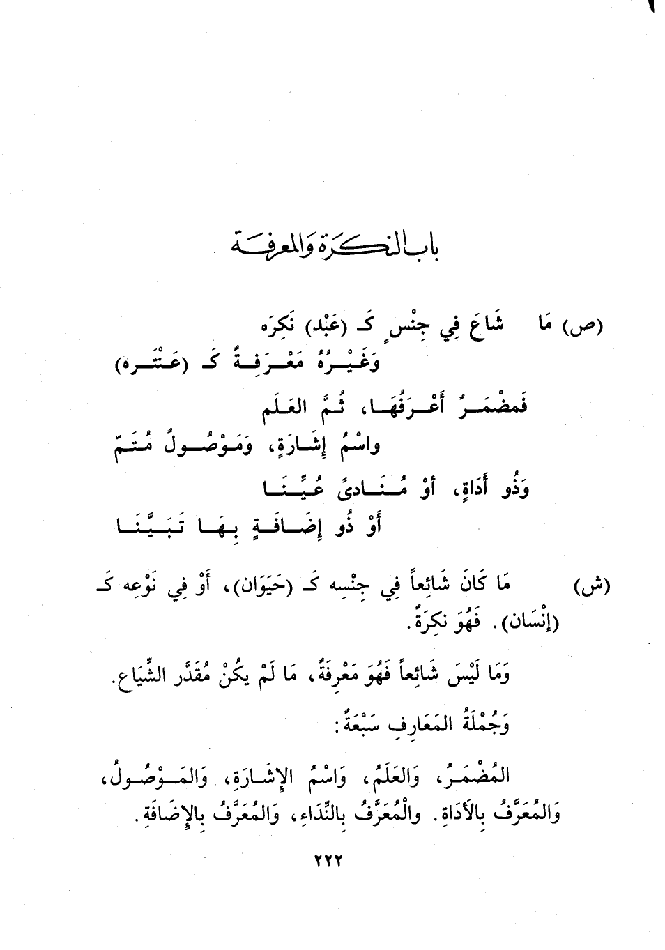 "ش": ما كان شائعًا في جنسه كـ"حيوان"، أو في نوعه كـ"إنسان". فهو نكرة.
