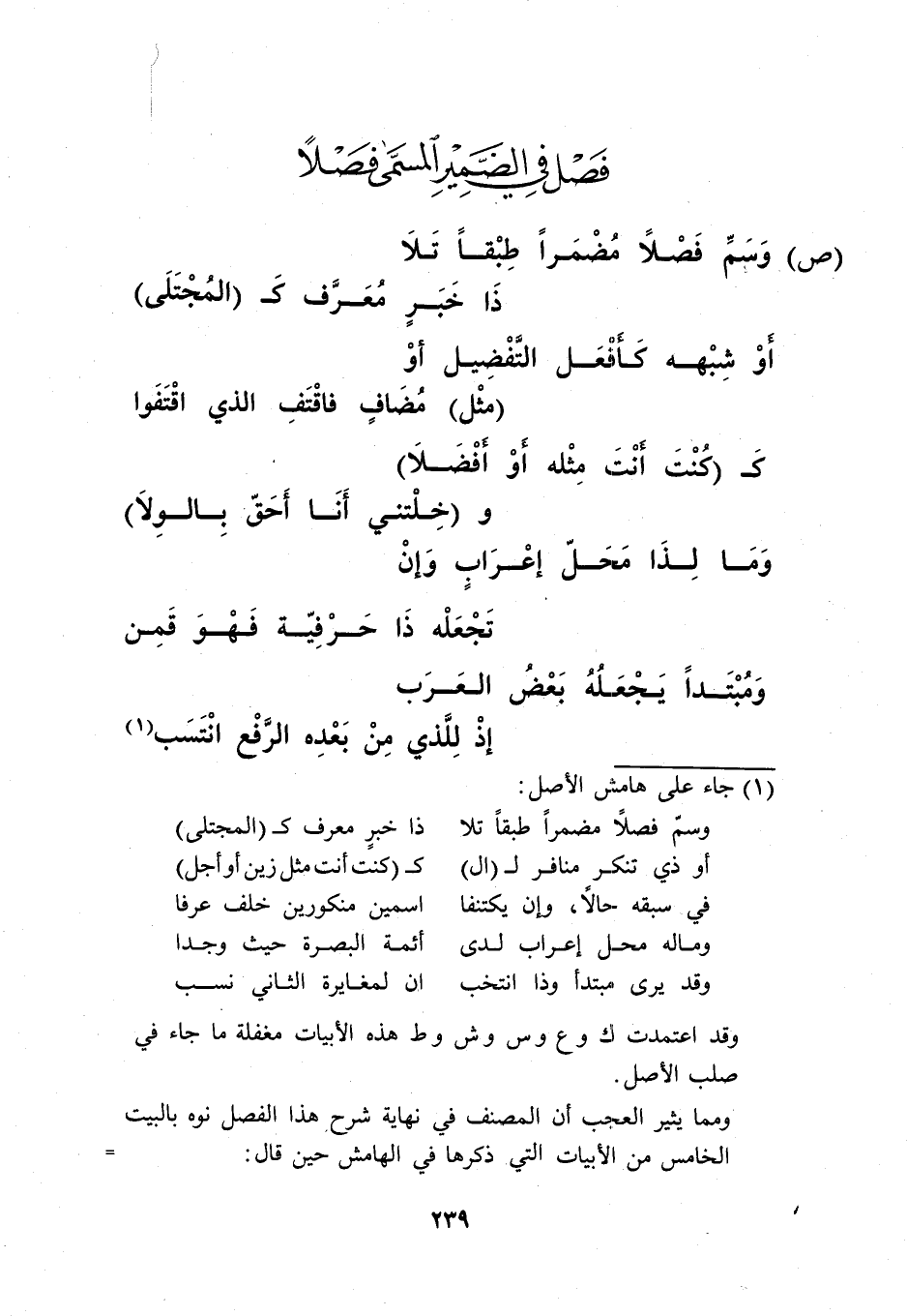 ومما يثير العجب أن المصنف في نهاية شرح هذا الفصل نوه بالبيت الخامس من الأبيات، التي ذكرها في الهامش حين قال: