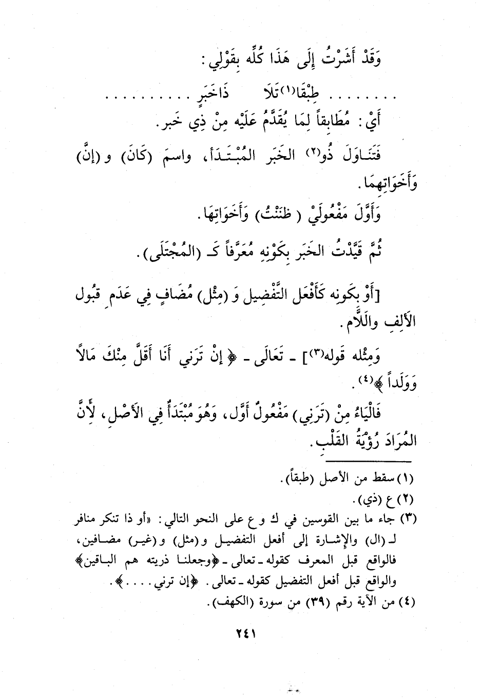 3 جاء ما بين القوسين في ك وع على النحو التالي: "أو ذا تنكر منافر لـ"ال" والإشارة إلى أفعل التفصيل و"مثل" و"غير" مضافين" فالواقع قبل المعرف كقوله تعالى: {وَجَعَلْنَا ذُرِّيَّتَهُ هُمُ الْبَاقِين} .