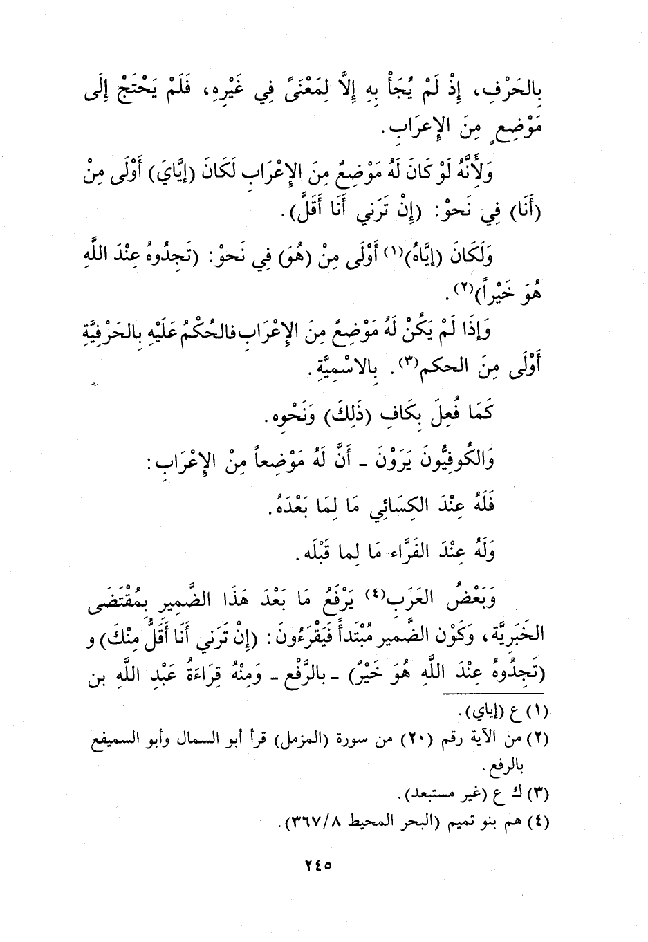 وبعض العرب4 يرفع ما بعد هذا الضمير بمقتضى الخبرية، وكون الضمير مبتدأ فَيَقْرَءُونَ: "إِنْ تَرَني أَنَا أَقَلَّ مِنْكَ" و"تجدوه عند الله هو خير" -بالرفع- ومنه قراءة عبد الله بن