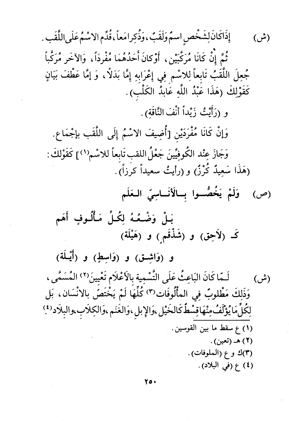 "ش": لما كان الباعث على التسمية بالأعلام تعيين2 المسمى، وذلك مطلوب في المألوفات3 كلها لم يختص بالإنسان، بل لكل ما يؤلف منها قسط كالخيل، والإبل، والغنم، والكلاب، والبلاد4.