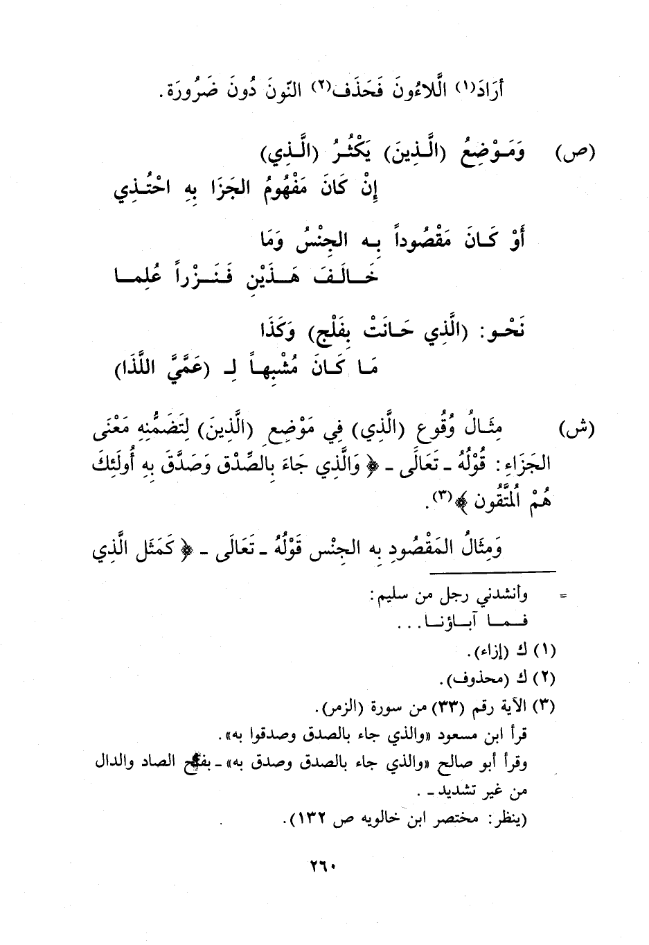 "ش": مثال وقوع "الذي" في موضع "الذين" لتضمنه معنى الجزاء: قوله تعالى: {وَالَّذِي جَاءَ بِالصِّدْقِ وَصَدَّقَ بِهِ أُولَئِكَ هُمُ الْمُتَّقُونَ} 3.