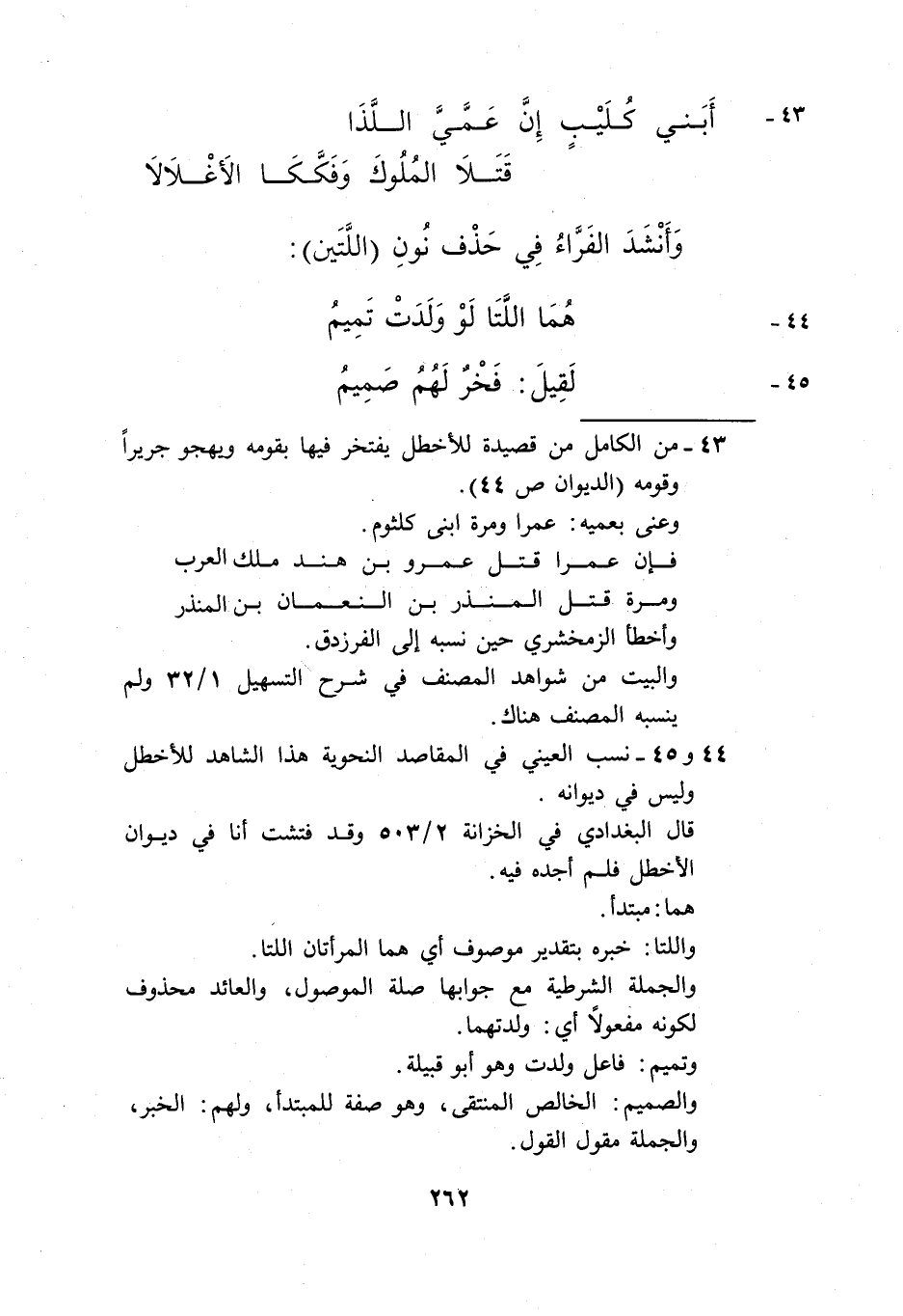 44 و 45- نسب العيني في المقاصد النحوية هذا الشاهد للأخطل، وليس في ديوانه.