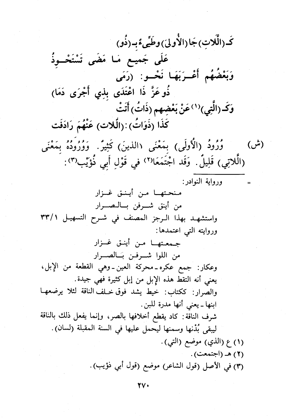 "ش": ورود "الأولى" بمعنى "الذين" كثير. ووروده بمعنى "اللاتي" قليل. وقد اجتمعا2 في قول أبي ذؤيب3: