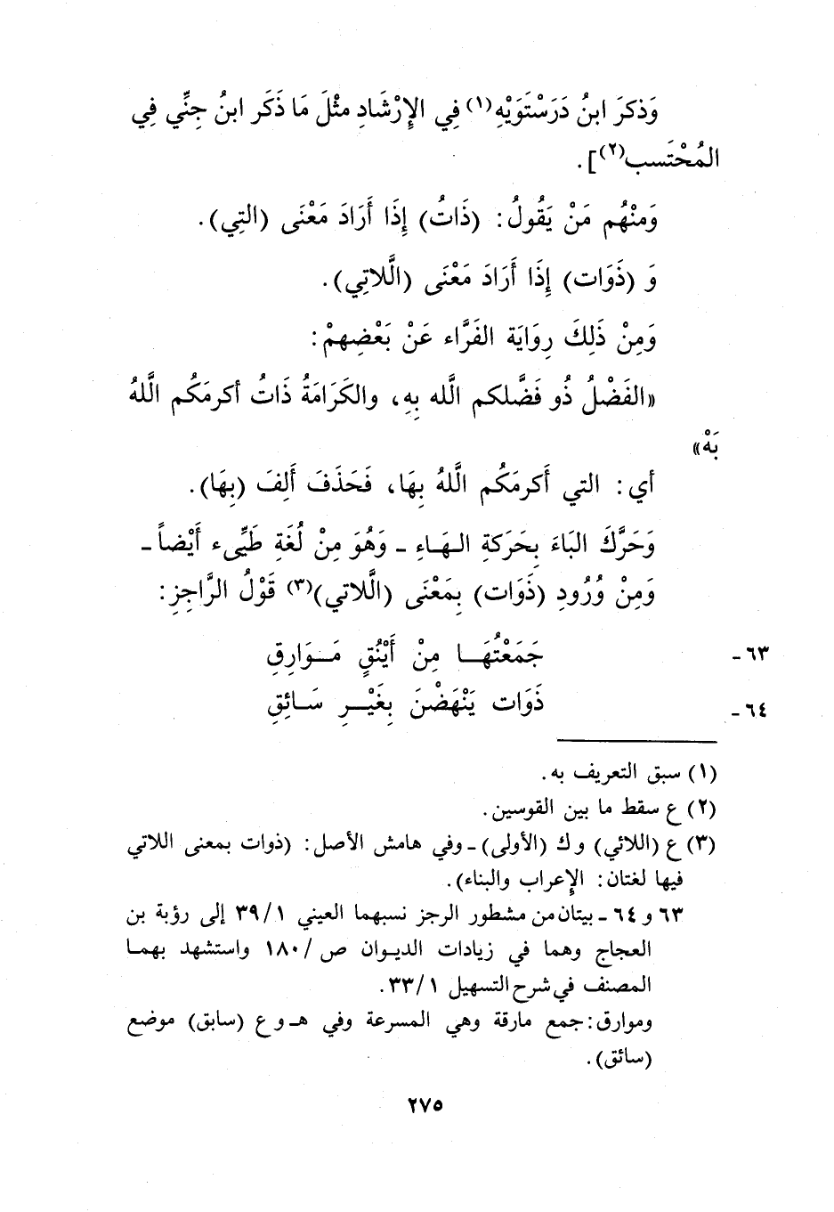 وحرك الباء بحركة الهاء -وهو من لغة طيئ أيضًا- ومن ورود "ذوات" بمعنى "اللاتي"3 قول الراجز: