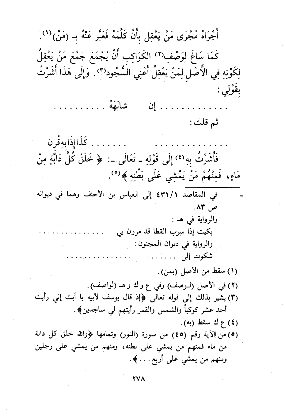 فأشرت به4 إلى قوله تعالى: {خَلَقَ كُلَّ دَابَّةٍ مِنْ مَاءٍ فَمِنْهُمْ مَنْ يَمْشِي عَلَى بَطْنِهِ} 5.