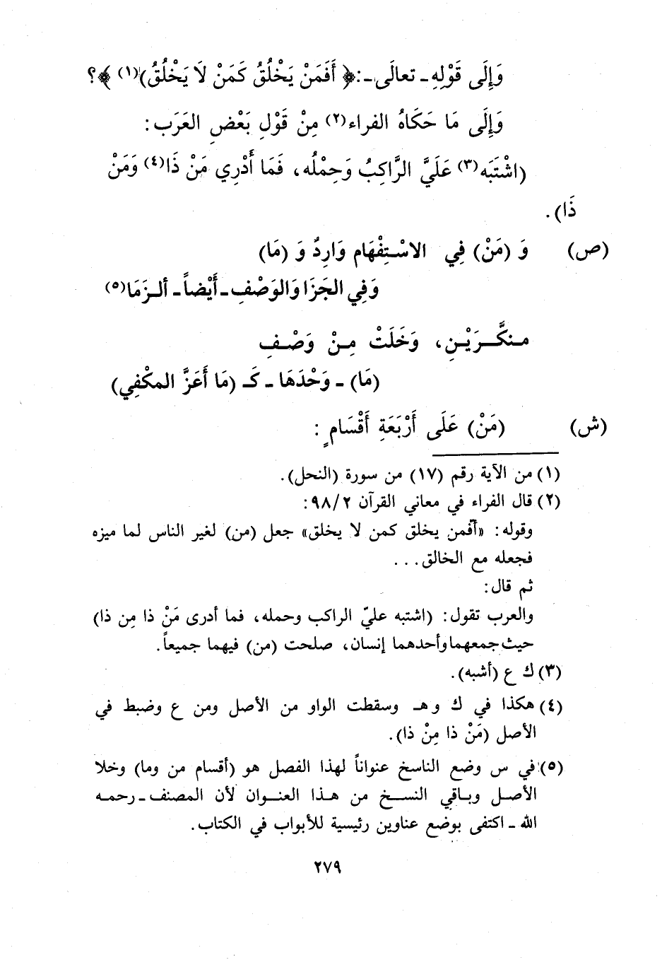5 في س وضع الناسخ عنوانًا لهذا الفصل هو "أقسام من وما" وخلا الأصل وباقي النسخ من هذا العنوان؛ لأن المصنف -رحمه الله- اكتفى بوضع عناوين رئيسية للأبواب في الكتاب.