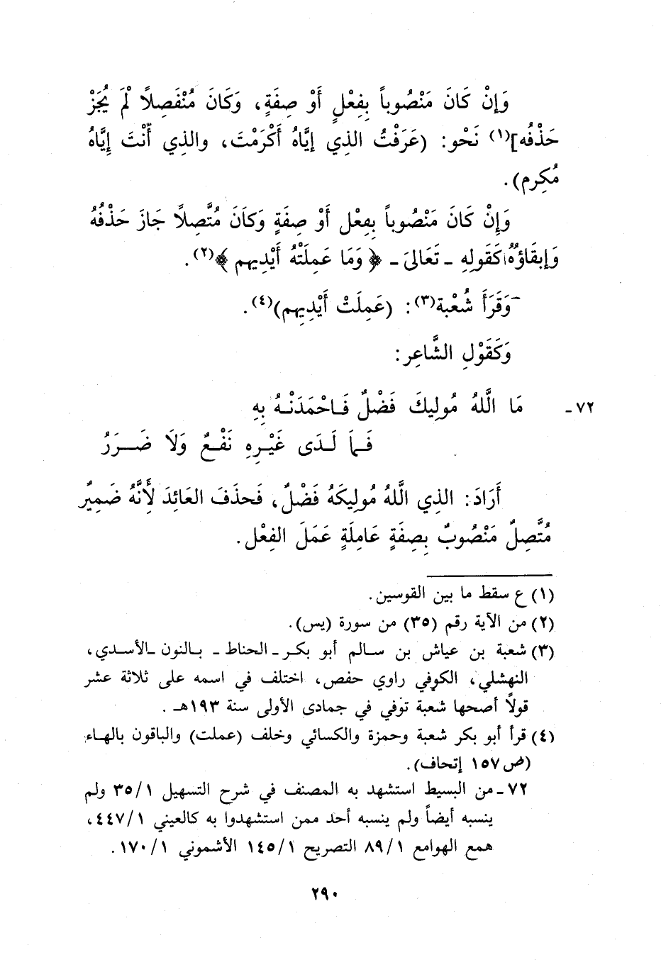وإن كان منصوبًا بفعل أو صفة، وكان متصلًا جاز حذفه وإبقاؤه" كقوله -تعالى: {وَمَا عَمِلَتْهُ أَيْدِيهِمْ} 2.