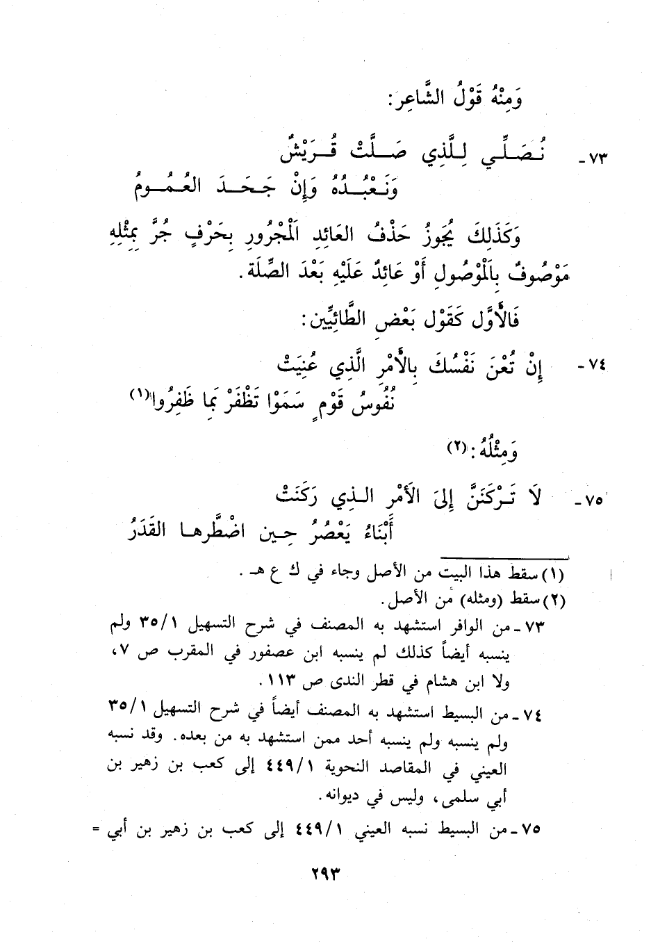 74- من البسيط استشهد به المصنف أيضًا في شرح التسهيل 1/ 35 ولم ينسبه ولم ينسبه أحد ممن استشهد به من بعده. وقد نسبه العيني في المقاصد النحوية 1/ 449 إلى كعب بن زهير بن أبي سلمى، وليس في ديوانه.