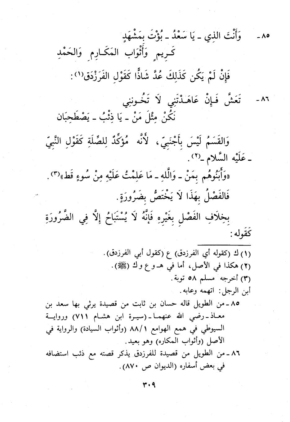 85- من الطويل قاله حسان بن ثابت من قصيدة يرثي بها سعد بن معاذ -رضي الله عنهما- "سيرة ابن هشام 711" ورواية السيوطي في همع الهوامع 1/ 88 "وأثواب السيادة" والرواية في الأصل "وأثواب المكاره" وهو بعيد.
