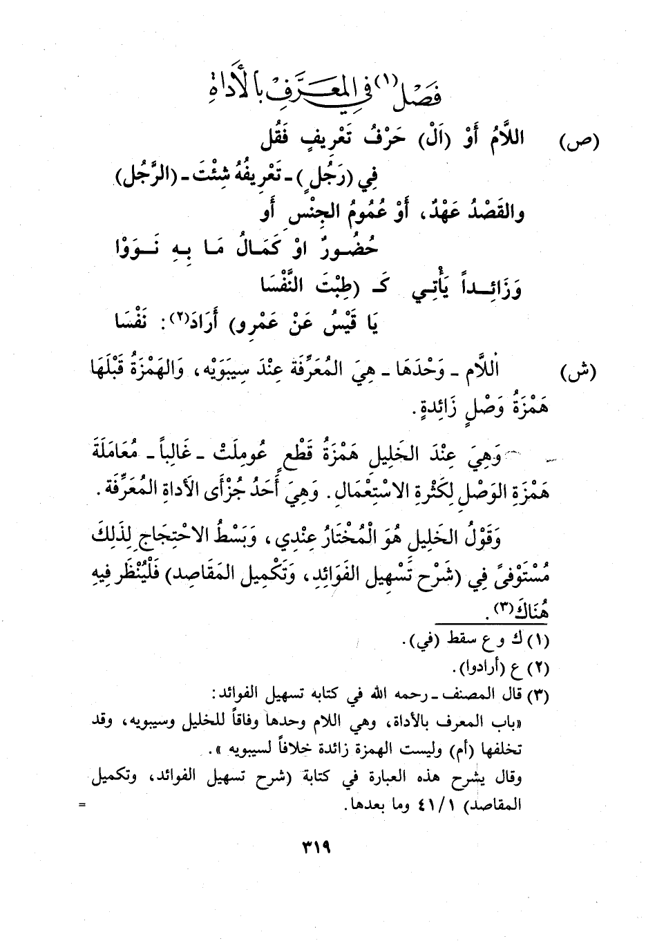 "باب المعرفة بالأداة، وهي اللام وحدها وفاقًا للخليل وسيبويه، وقد تخلفها "أم"، وليست الهمزة زائدة خلافًا لسيبويه".