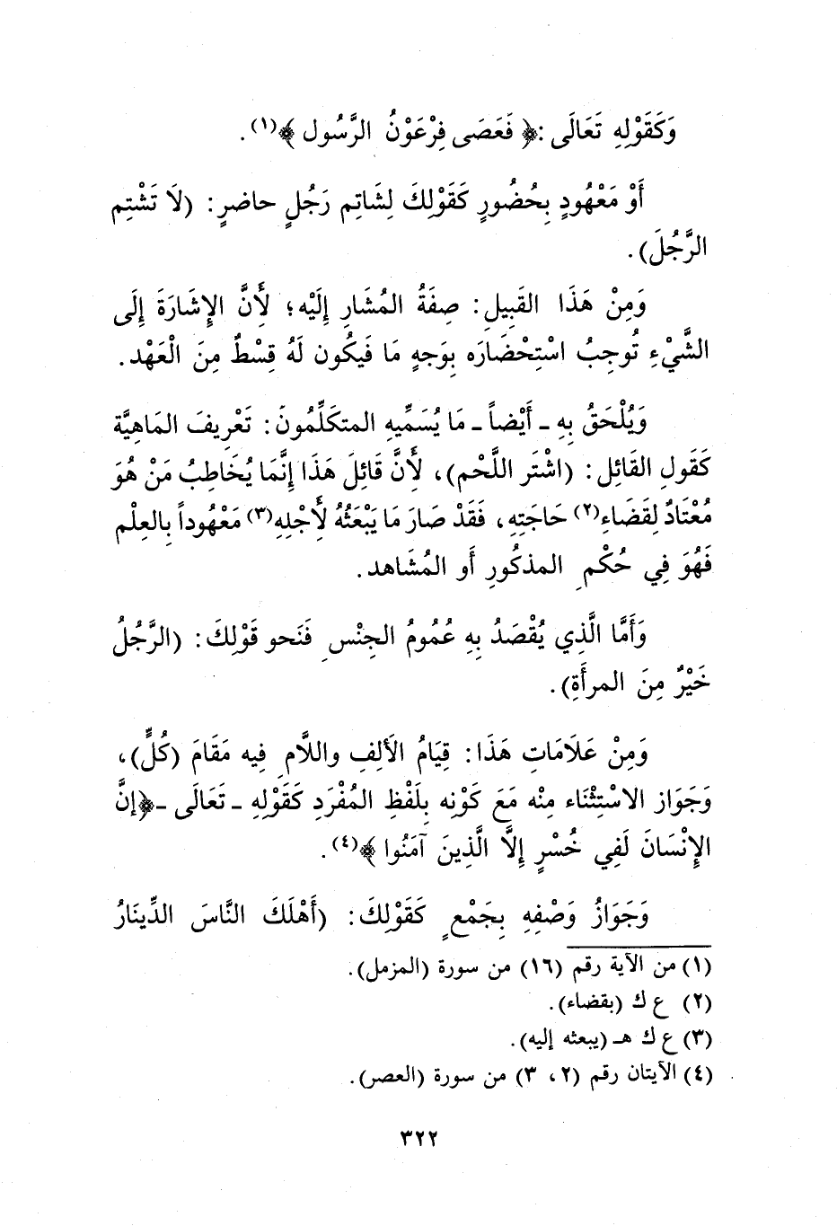 ويلحق به -أيضًا- ما يسميه المتكلمون: تعريف الماهية كقول القائل: "اشتر اللحم"؛ لأن قائل هذا إنما يخاطب من هو معتاد لقضاء2 حاجته، فقد صار ما يبعثه لأجله3 معهودًا بالعلم، فهو في حكم المذكور أو المشاهد.