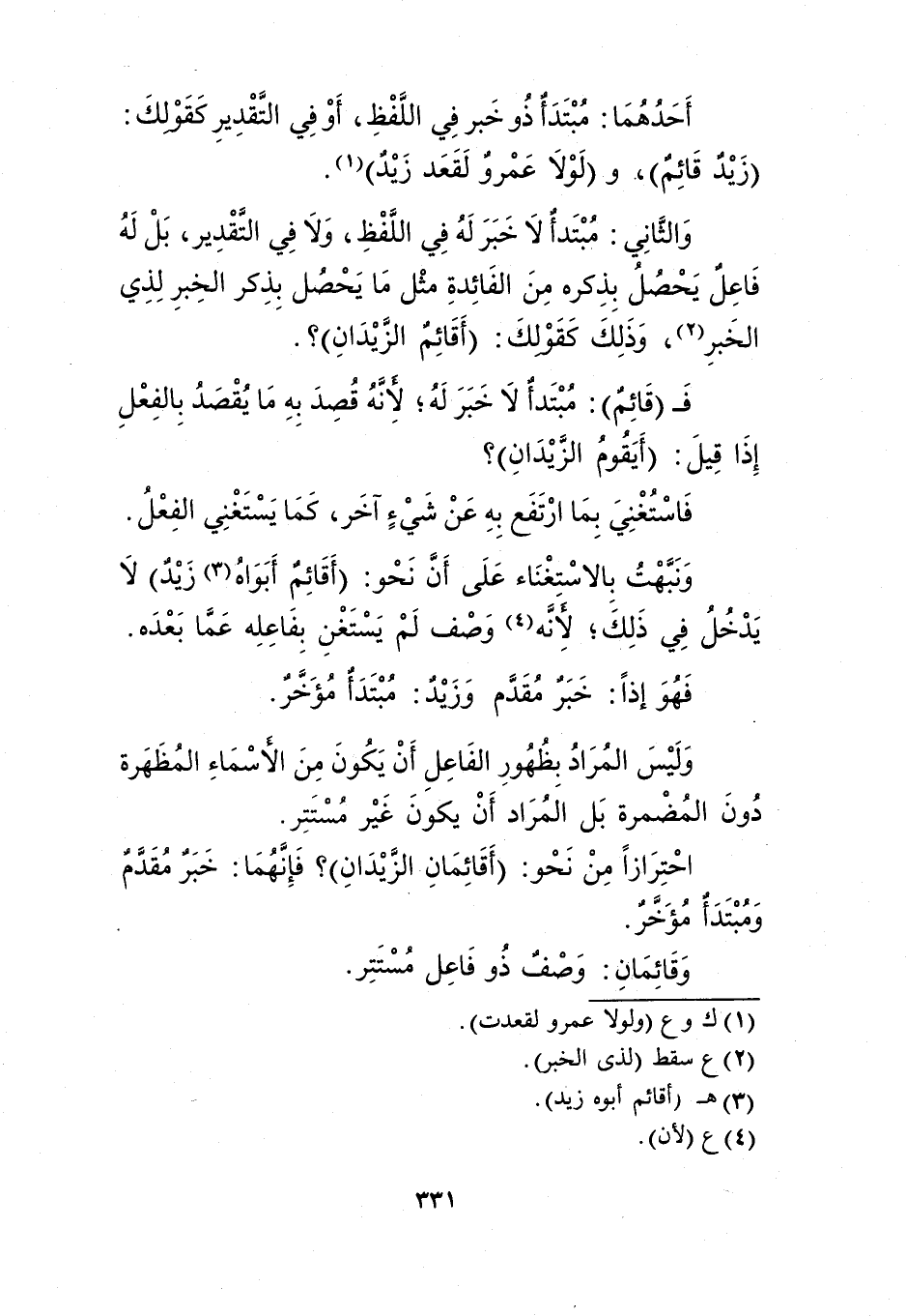 أحدهما: مبتدأ ذو خبر في اللفظ، أو في التقدير كقولك: "زيد قائم"، و"لولا عمرو لقعد زيد"1.