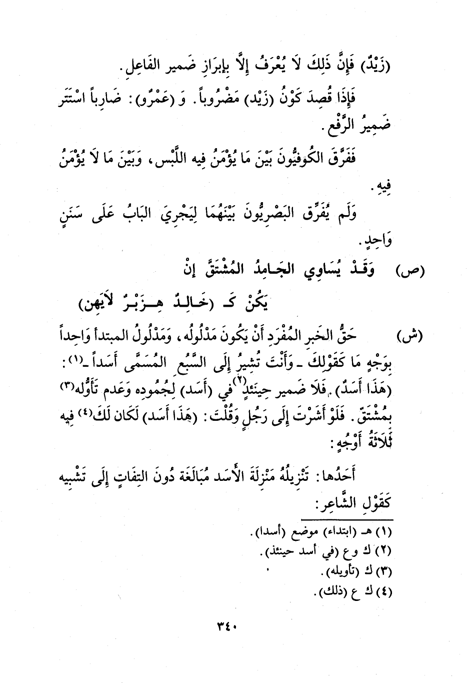 "هذا أسد" فلا ضمير حينئذ2 في "أسد" لجموده وعدم تأوله3 بمشتق. فلو أشرت إلى رجل وقلت: "هذا أسد" لكان لك4 فيه ثلاثة أوجه: