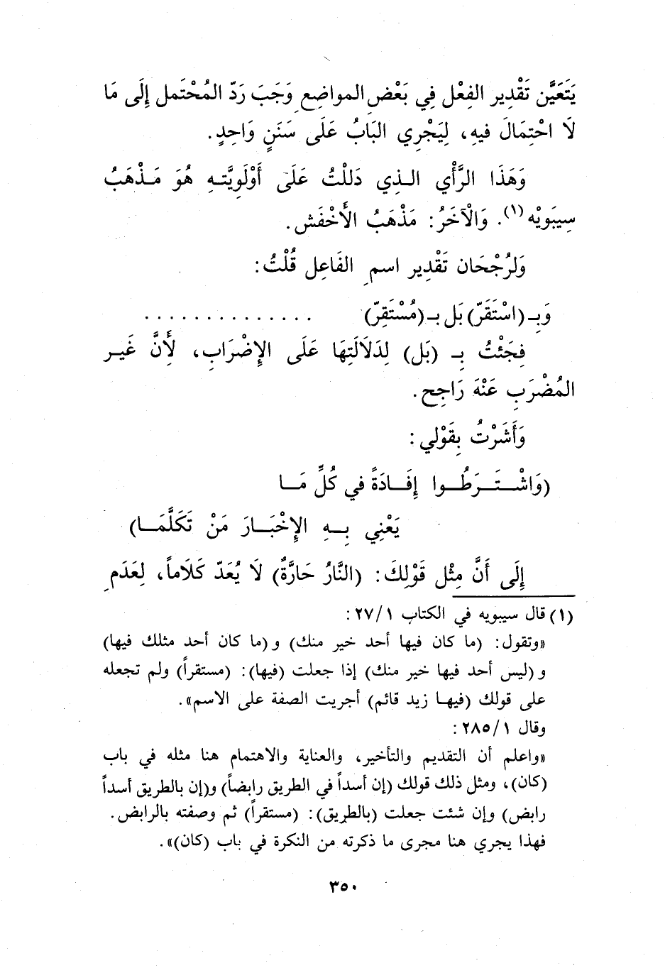 "واعلم أن التقديم والتأخير، والعناية والاهتمام هنا مثله في باب "كان"، ومثل ذلك قولك "إن أسدًا في الطريق وأيضًا" و"إن بالطريق أسد رابض" وإن شئت جعلت "بالطريق": "مستقرًا" ثم وصفته بالرابض.