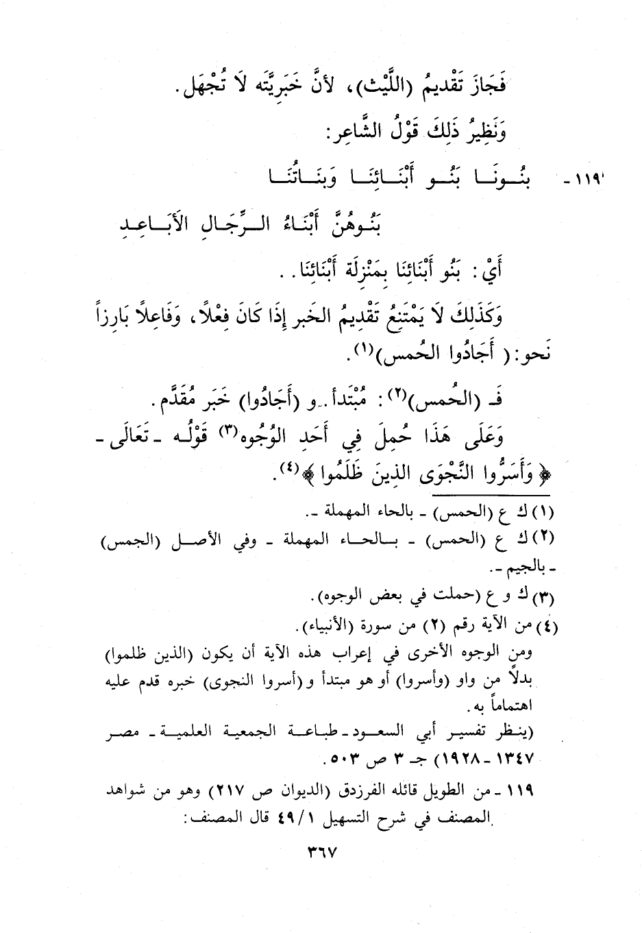 119- من الطويل قائله الفرزدق "الديوان ص 217"، وهو من شواهد المصنف في شرح التسهيل 1/ 49 قال المصنف: وسهل في البيت العكس وضوح المعنى، والعلم بأن الأعلى لا يشبه بالأدنى.