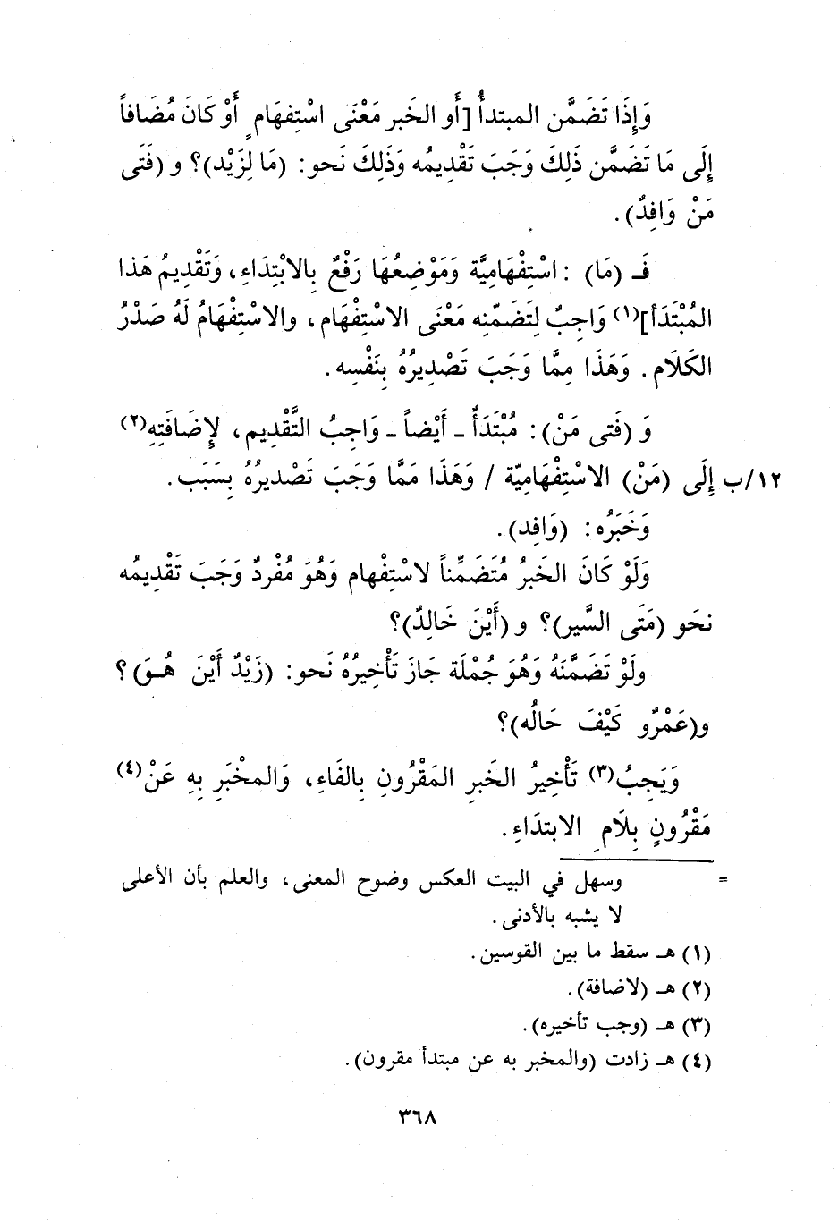 وإذا تضمن المبتدأ "أو الخبر معنى استفهام، أو كان مضافًا إلى ما تضمن ذلك وجب تقديمه وذلك نحو: "ما لزيد"؟ و"فتى من وافد".