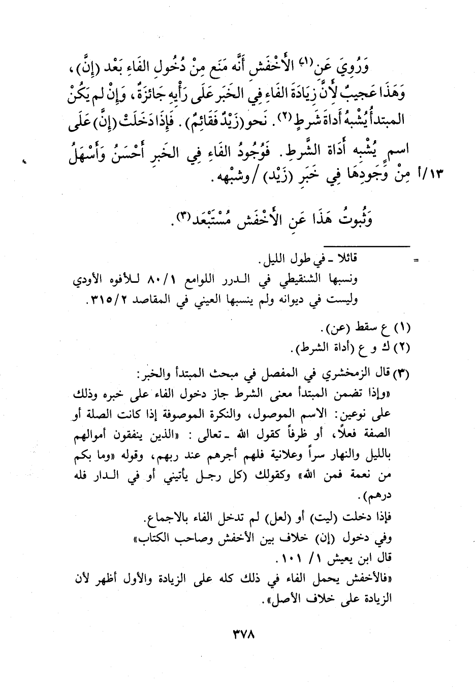وروي عن1 الأخفش أنه منع من دخول الفاء بعد "إن"، وهذا عجيب؛ لأن زيادة الفاء في الخبر على رأيه جائزة، وإن لم يكن المبتدأ يشبه أداة شرط2. نحو "زيد فقائم" فإن دخلت "إن" على اسم يشبه أداة الشرط. فوجود الفاء في الخبر أحسن وأسهل من وجودها في خبر "زيد" وشبهه.