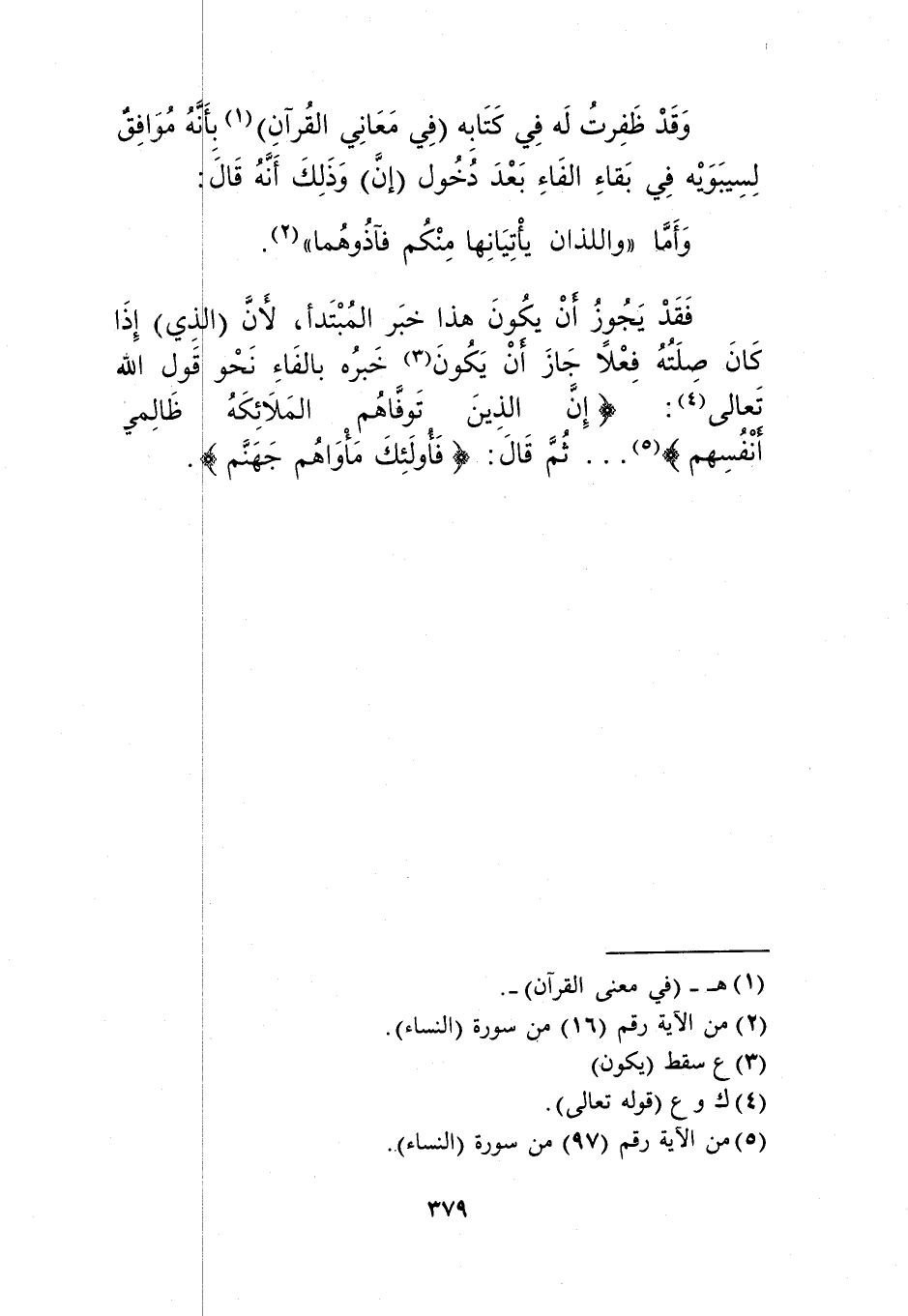 فقد يجوز أن يكون هذا خبر المبتدأ؛ لأن "الذي" إذا كان صلته فعلًا جاز أن يكون3 خبره بالفاء نحو قول الله تعالى4: {إِنَّ الَّذِينَ تَوَفَّاهُمُ الْمَلائِكَةُ ظَالِمِي أَنْفُسِهِمْ} 5.... ثم قال: {فَأُولَئِكَ مَأْوَاهُمْ جَهَنَّمُ} .