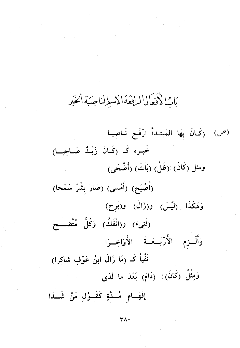 كان بها المبتدأ ارفع ناصبًا ... خبره كـ"كان زيد صاحبا"