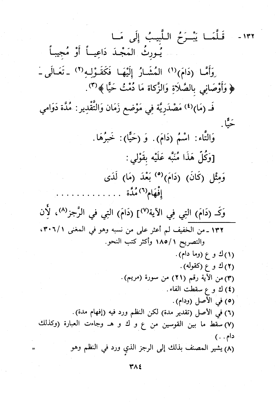 وأما "دام"1المشار إليها فكقوله2 تعالى: {وَأَوْصَانِي بِالصَّلاةِ وَالزَّكَاةِ مَا دُمْتُ حَيًّا} 3.