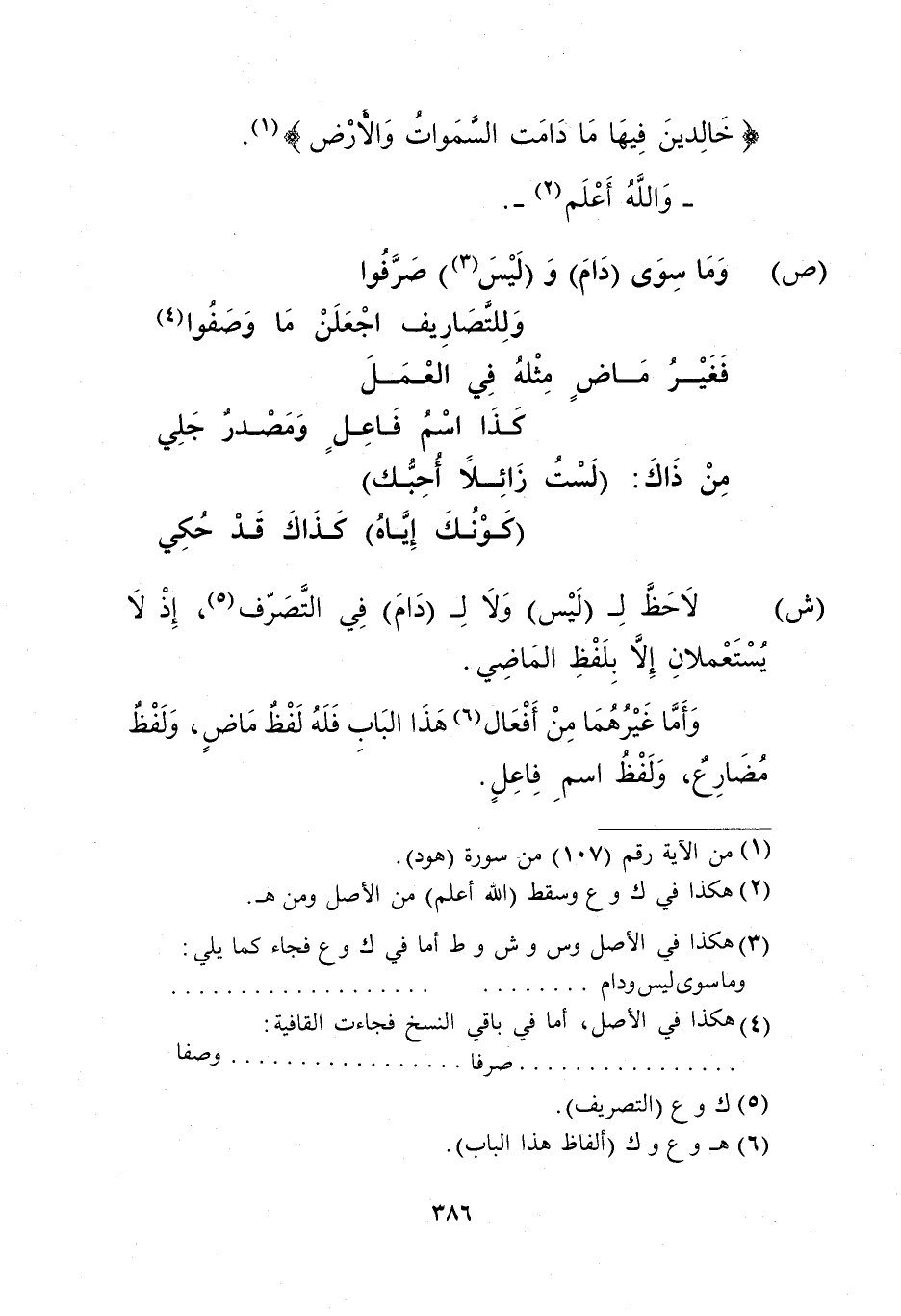 "ش": لاحظ لـ"ليس" ولا لـ"دام" في التصرف5، إذ لا يستعملان إلا بلفظ الماضي.