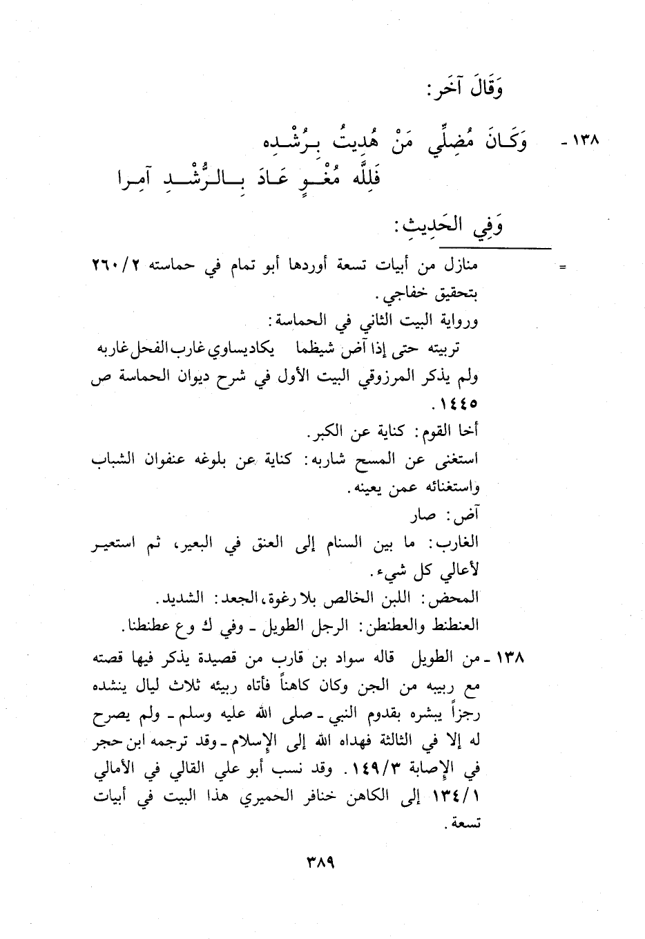 138- من الطويل قاله سواد بن قارب من قصيدة يذكر فيها قصته مع ربيبه من الجن وكان كاهنًا فأتاه ربيئه ثلاث ليال ينشده رجزًا يبشره بقدوم النبي -صلى الله عليه وسلم- ولم يصرح له إلا في الثالثة، فهداه الله إلى الإسلام -وقد ترجمه ابن حجر في الإصابة 2/ 149. وقد نسب أبو علي القالي في الأمالي 1/ 134 إلى الكاهن خنافر الحميري هذا البيت في أبيات تسعة.