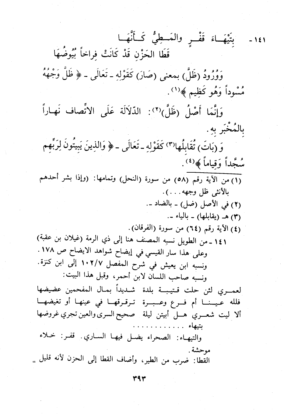141- من الطويل نسبة المصنف هنا إلى ذي الرمة "غيلان بن عقبة"، وعلى هذا سار القيسي في إيضاح شواهد الإيضاح ص 178. ونسبه ابن يعيش في شرح المفصل 7/ 102 إلى ابن كنزة، ونسبه صاحب اللسان لابن أحمر، وقبل هذا البيت: