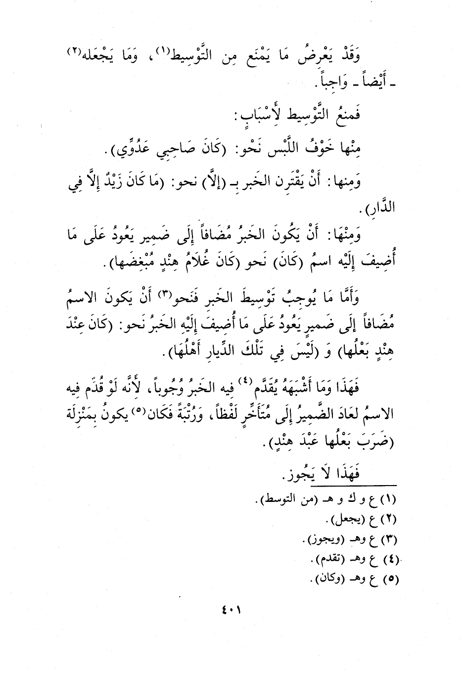وأما ما يوجب توسيط الخبر فنحو3 أن يكون الاسم مضافًا إلى ضمير يعود على ما أضيف إليه الخبر نحو: "كان عند هند بعلها" و"ليس في تلك الديار أهلها".