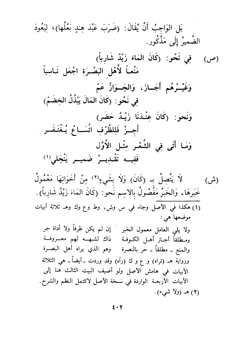 في نحو: "كان الماء زيد شاربًا" ... منعًا لأهل البصرة اجعل ناسبًا