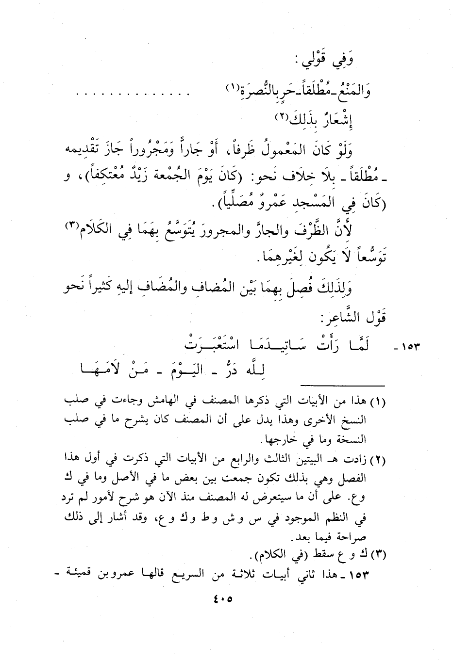 1 هذا من الأبيات التي ذكرها المصنف في الهامش، وجاءت في صلب النسخ الأخرى وهذا يدل على أن المصنف، كان يشرح ما في صلب النسخة وما في خارجها.