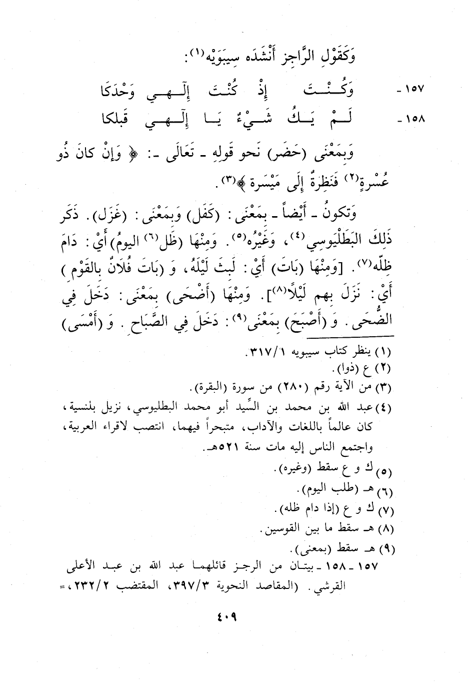 157- 158- بيتان من الرجز قائلهما عبد الله بن عبد الأعلى القرشي. "المقصاد النحوية 3/ 397، المقتضب 2/ 232، شرح المفصل لابن يعيش 2/ 11". ورواية ع "إذا كنت".