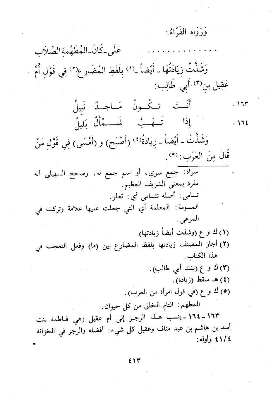 163- 164- بنسب هذا الرجز إلى أم عقيل، وهي فاطمة بنت أسد بن هاشم بن عبد مناف وعقيل كل شيء: أفضله والرجز في الخزانة 4/ 41 وأوله: