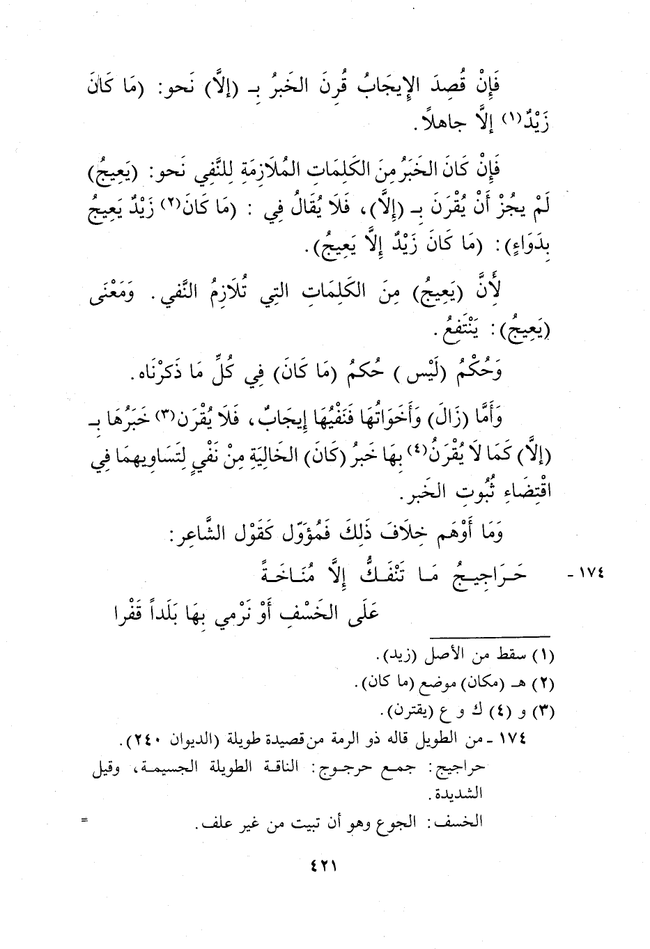 وأما "زال" وأخواتها فنفيها إيجاب، فلا يقرن3 خبرها بـ"إلا" كما لا يقرن4 بها خبر "كان" الخالية من نفي لتساويهما في اقتضاء ثبوت الخبر.