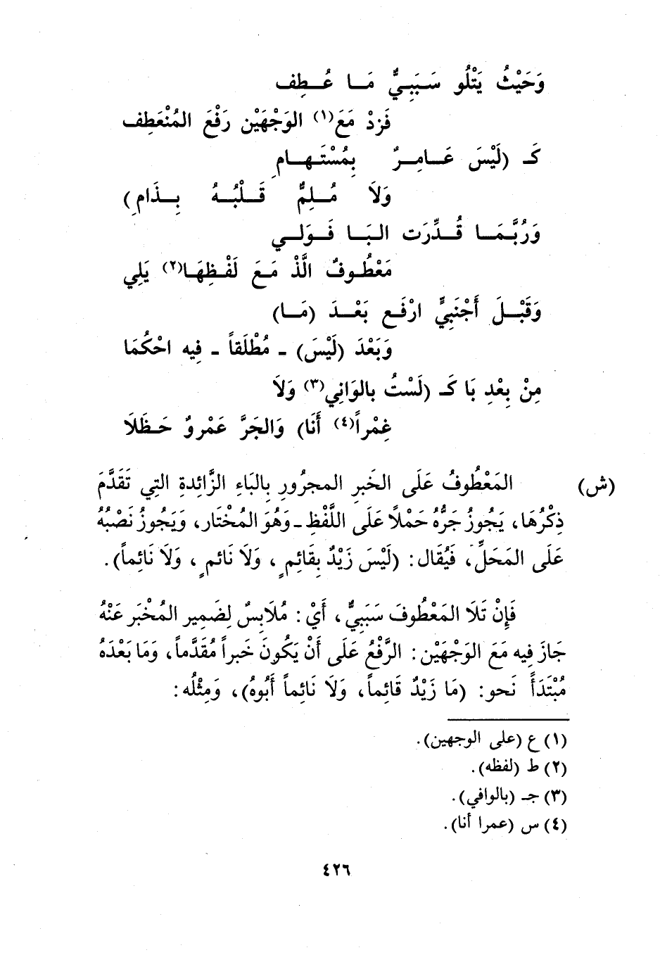 "ش": المعطوف على الخبر المجرور بالباء الزائدة التي تقدم ذكرها، يجوز جره حملًا على اللفظ -وهو المختار، ويجوز نصبه على المحل، فيقال: "ليس زيد بقائم، ولا نائم، ولا نائمًا".