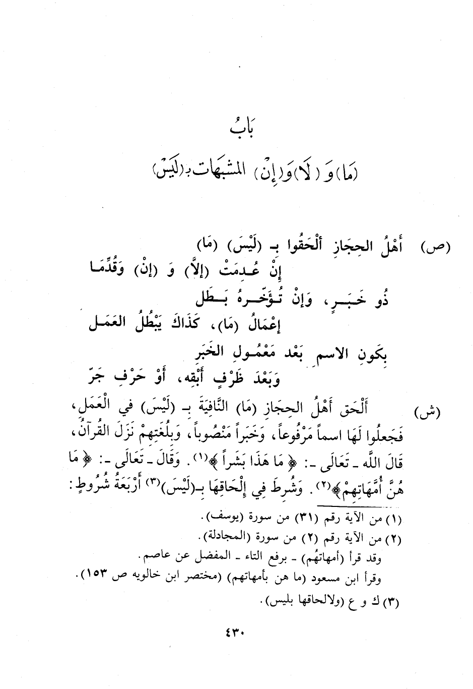 "ش": ألحق أهل الحجاز "ما" النافية بـ"ليس" في العمل، فجعلوا لها اسمًا مرفوعًا، وخبرًا منصوبًا، وبلغتهم نزل القرآن، قال الله -تعالى: {مَا هَذَا بَشَر} 1. وقال -تعالى: {مَا هُنَّ أُمَّهَاتِهِم} 2. وشرط في إلحاقها بـ"ليس"3 أربعة شروط: