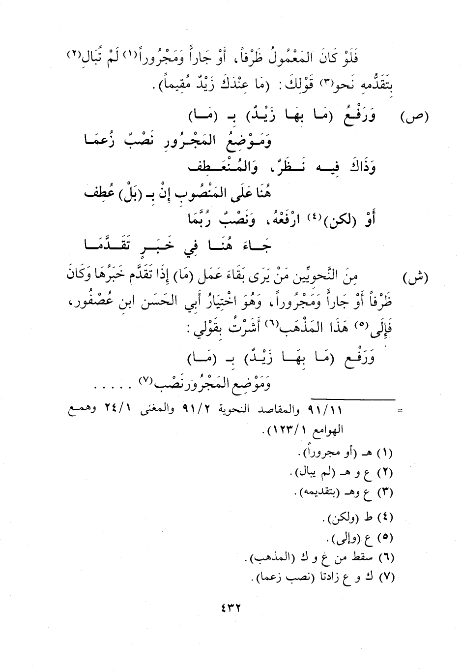 "ش" من النحويين من يرى بقاء عمل "ما" إذا تقدم خبرها وكان ظرفًا أو جارًا أو مجرورًا، وهو اختيار أبي الحسن ابن عصفور، فإلى5 هذا المذهب6 أشرت بقولي:
