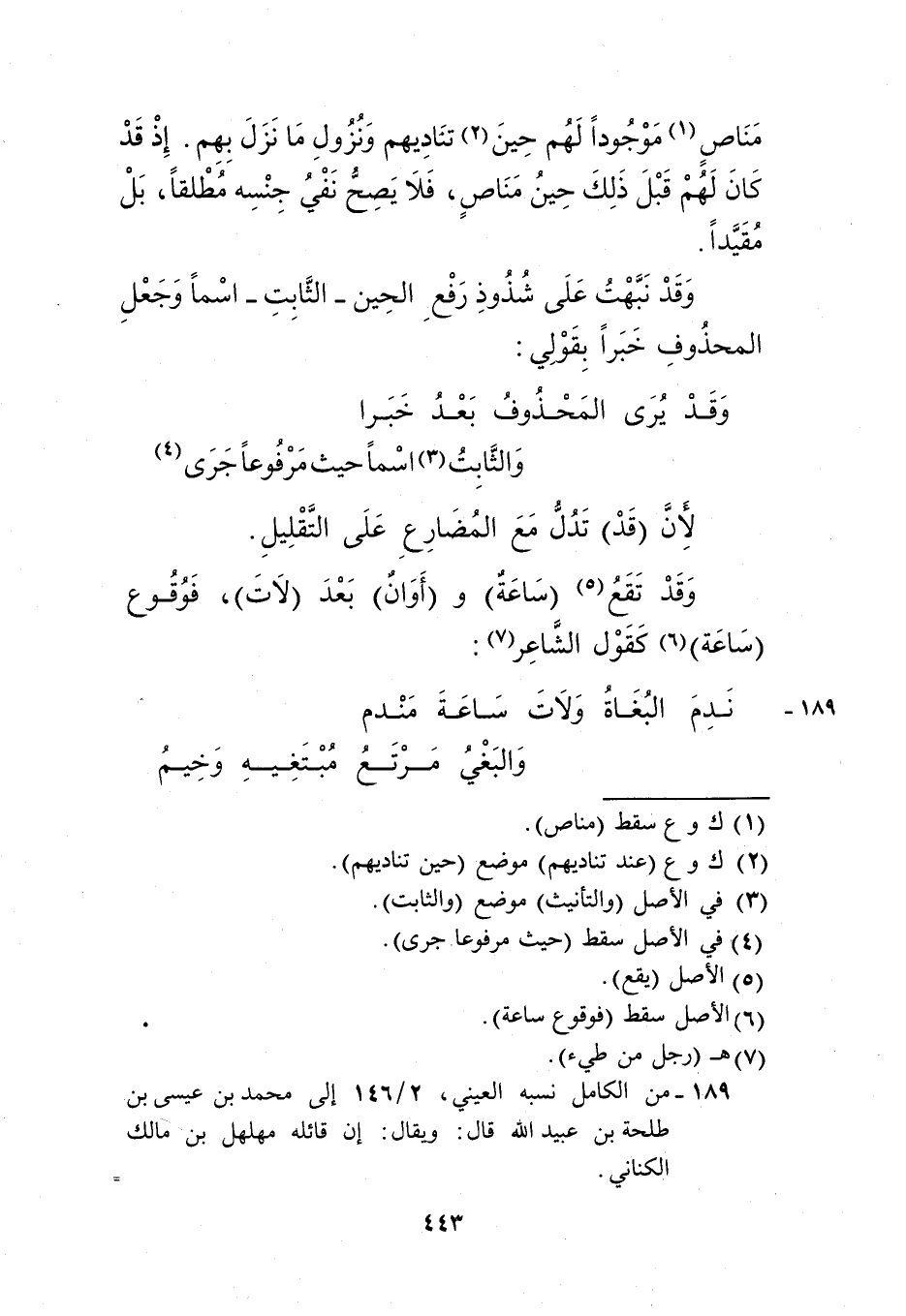 189- من الكامل نسبه العيني، 2/ 146 إلى محمد بن عيسى بن طلحة بن عبيد الله قال: ويقال: إن قائله مهلهل بن مالك الكناني.