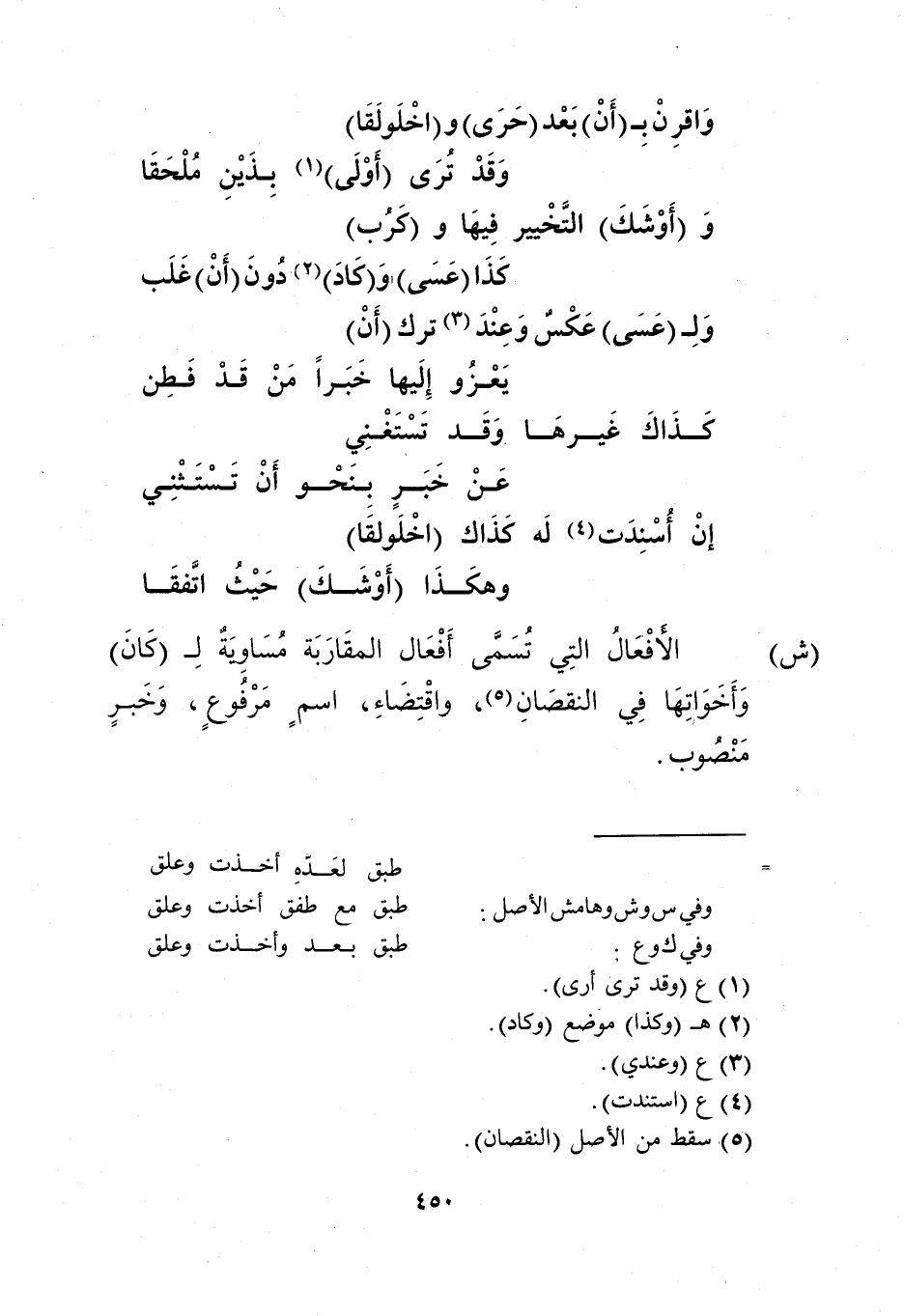 "ش": الأفعال التي تسمى أفعال المقاربة مساوية لـ"كان" وأخواتها في النقصان5، واقتضاء، اسم مرفوع، وخبر منصوب.