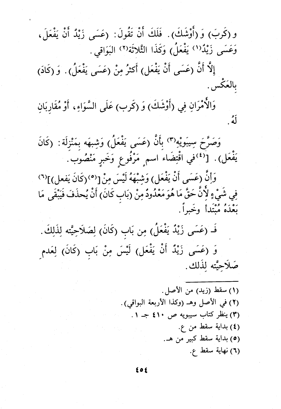 وصرح سيبويه3 بأن "عسى يفعل" وشبهه بمنزلة: "كان يفعل". "4في اقتضاء اسم مرفوع وخبر منصوب.