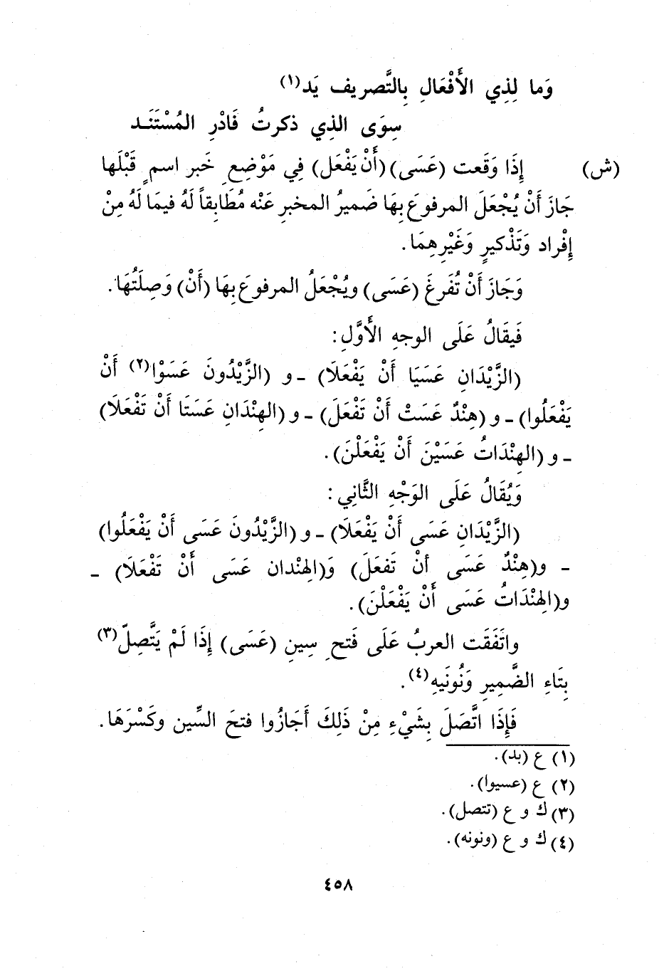 "الزيدان عسيا أن يفعلا" -و"الزيدون عسوا2 أن يفعلوا"- و"هند عست أن تفعل" -و"الهندان عستا أن تفعلا"- و"الهندات عسين أن يفعلن".