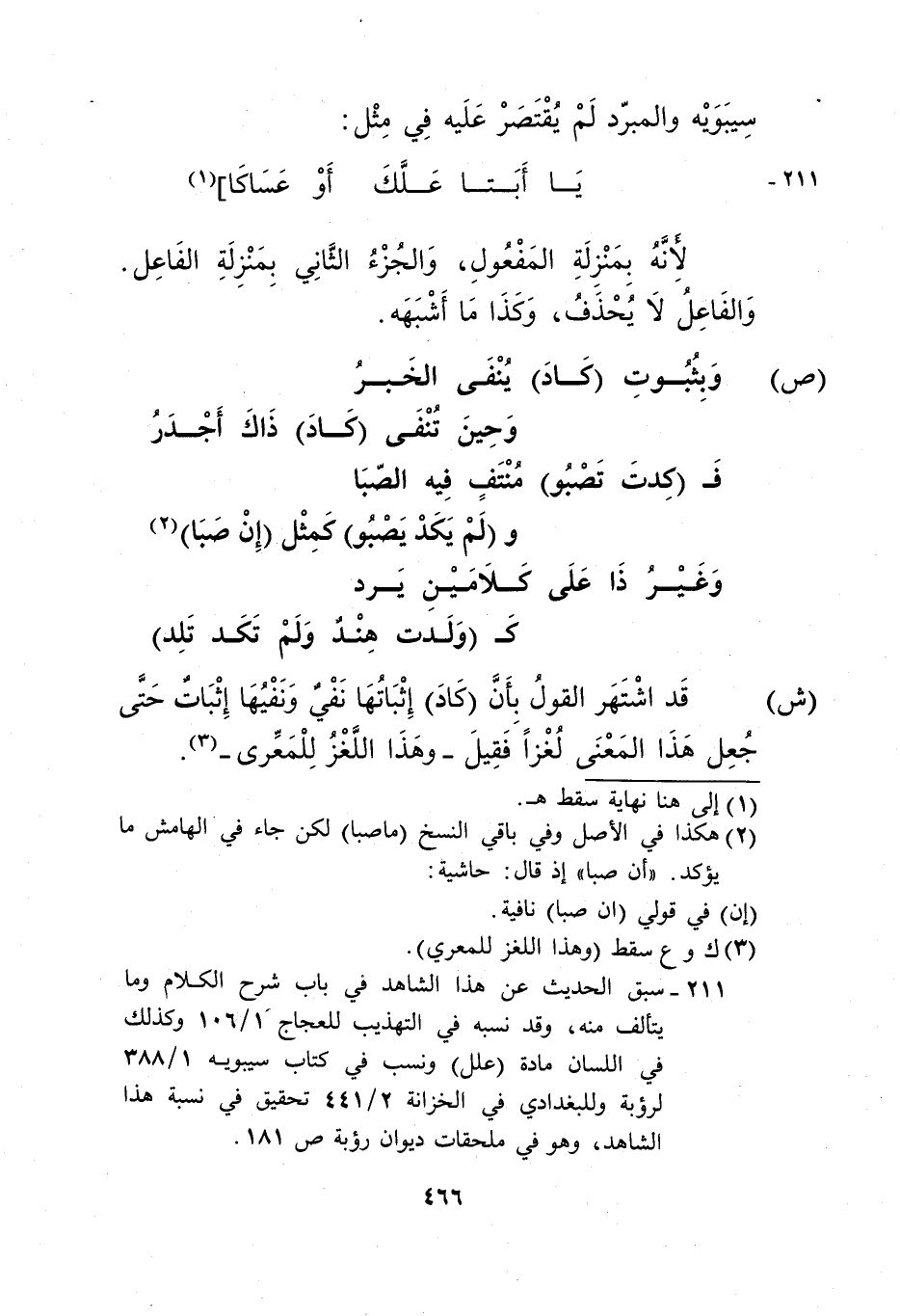 211- سبق الحديث عن هاذ الشاهد في باب شرح الكلام وما يتألف منه، وقد نسبه في التهذيب للعجاج1/ 106 وكذلك في اللسان مادة "علل"، ونسب في كتاب سيبويه 1/ 388 لرؤبة وللبغدادي في الخزانة 2/ 441 تحقيق في نسبة هذا الشاهد، وهو في ملحقات ديوان رؤبة ص 181.